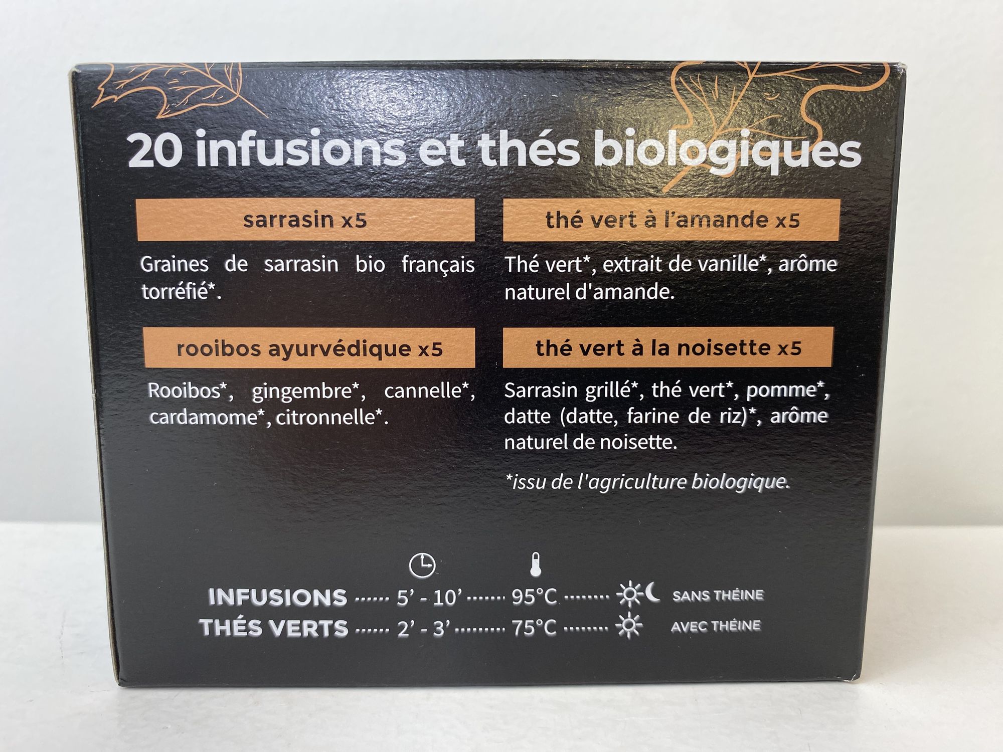 INFUSIONS: Infuser dans de l’eau à 95°, laisser 5 à 10 minutes. Sans théine.